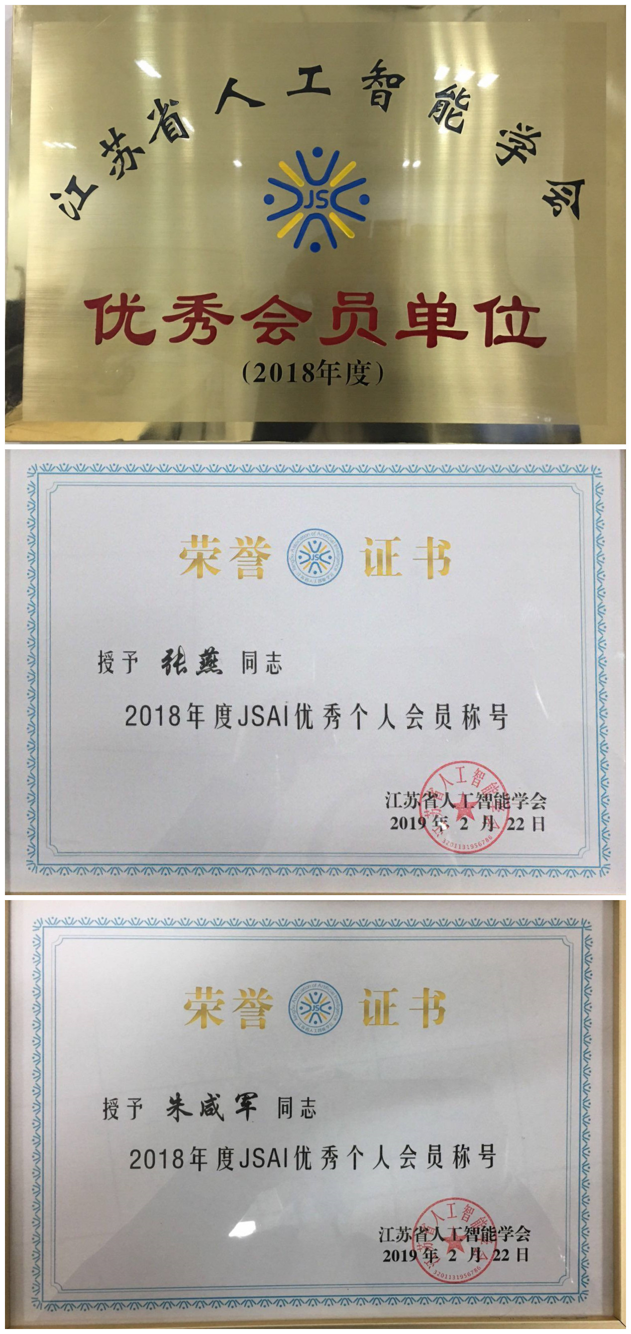 江苏省人工智能学会在《关于2018年度先进集体和个人的决定(苏智会【2018】9号)》中决定授予威尼斯9499登录入口为江苏省人工智能学会优秀会员单位(2018年度),授予张燕副校长和朱咸军博士为2018年度JSAI优秀个人会员称号,并授予2017级陈亭谕同学和郭孝斌同学为2018年度JSAI优秀志愿者称号。
