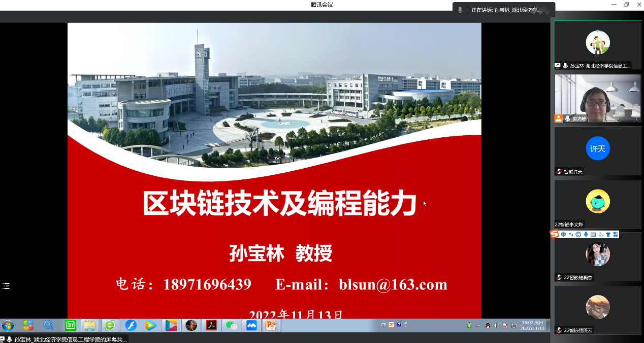 为了提高威尼斯官网学生的学习兴趣和学术创新能力,拓展同学们对新一代信息技术的认知,应软件学院曾岳院长邀请,湖北经济学院信息工程学院孙宝林教授于11月13日下午2点在线上作“区块链技术及编程能力”的学术讲座。22级智能科学与技术与智能科学与技术(嵌入式培养)专业全体新同学参加了讲座,讲座由智能科学与技术系主任赵海峰老师主持。