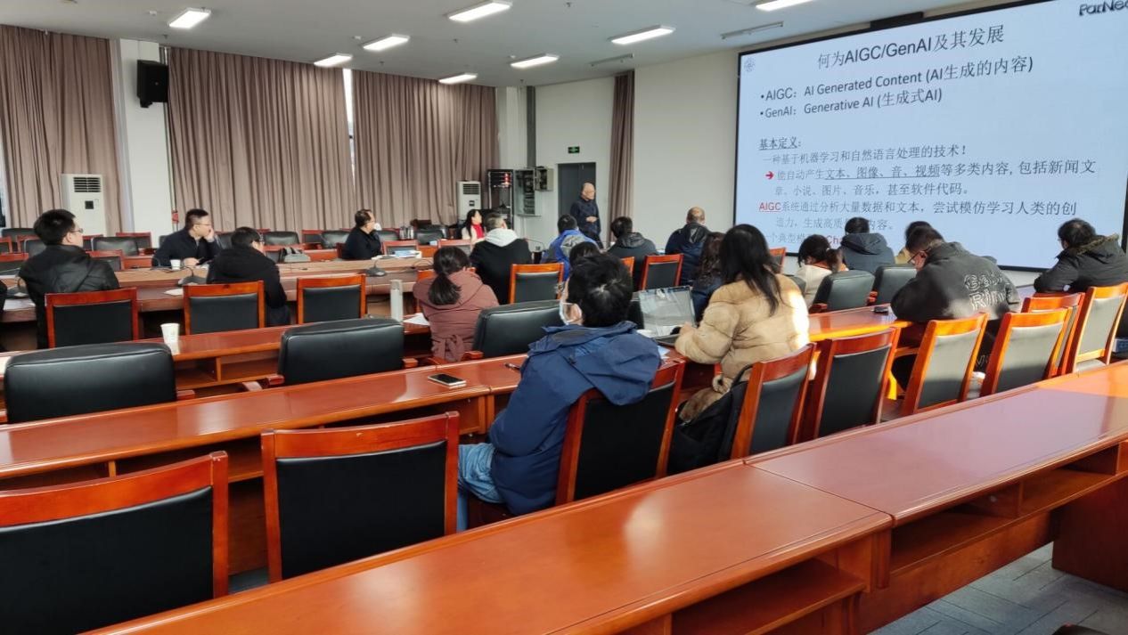 陈教授以“AIGC+教育: 一些思考”为题,主要介绍了AIGC/GenAI(AI生成的内容/生成式AI)核心技术及其发展现状、对发挥 AIGC作用的一些思考、国家和联合国的相关政策和指南、针对教育领域AIGC有啥“能”以及AIGC在教育中面临的宏观问题等内容,并结合自己的科学研究和教育教学经历,引领学科组教师如何开展人工智能方向的科学研究和教育教学研究指明了方向,并提出许多实质性的建议。