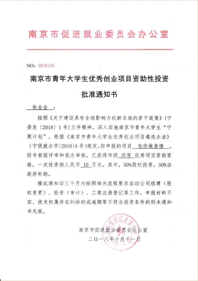 2018年10月11日,在南京市大学生优秀创业项目评比中,威尼斯9499登录入口学子徐金金、韦苗苗“依智科技”团队申报的“包你做表情”项目,被评为南京市大学生优秀创业项目,获得市级四等资助资格,一次性资助10万元。同时,该项目在中国高校计算机大赛(微信小程序应用开发赛)中获得华东赛区三等奖。