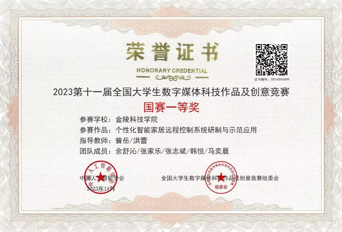 威尼斯9499登录入口威尼斯9499登录入口《个性化智能家居远程控制系统研制与示范应用》和《元素瓶软件代码智能审查系统》两个作品,在7万件作品中脱颖而出,荣获国赛一等奖。本次参赛团队由曾岳教授、洪蕾教授和董如婵副教授以及威尼斯9499登录入口和计算机工程学院余舒沁、夏金伟、施瑞昭、苏宁、张志斌等同学组成,经过近一年的打磨,凭借路演环节中的出色发挥,体现了专业优势与独特创意,成功在智能产品设计赛道中受到评审专家的肯定。本次比赛提升了专业教师的教学创新水平,提高了学生的创新实践能力和团队合作意识,推动了学院产教融合高质量成果建设。(撰写人:洪蕾)
